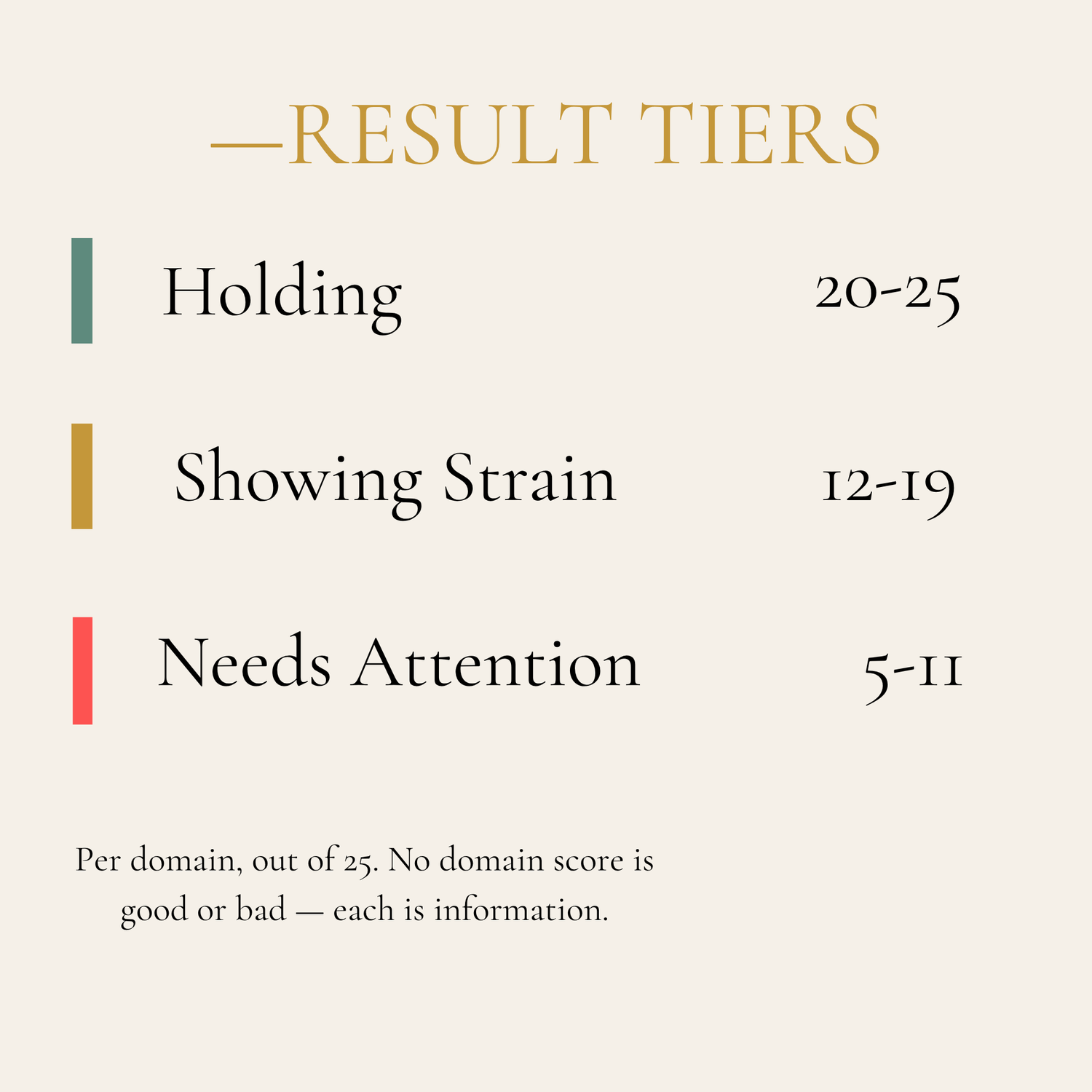 The diagnostic takes 8–10 minutes. You rate 25 statements across five domains. What you receive is a structural profile — a clear picture of where your foundations are holding and where they are showing strain.